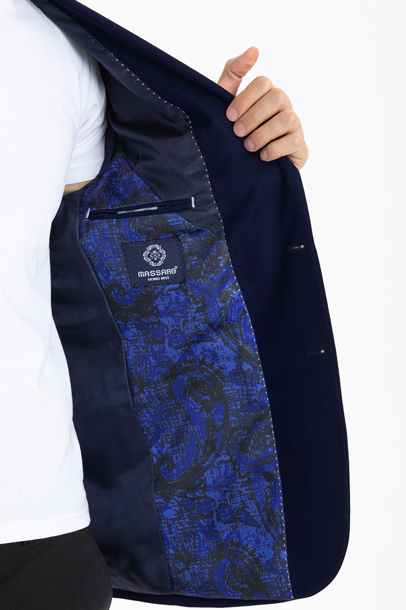Elegancka marynarka męska w przepięknym kolorze, uszyta z wysokiej jakości tkaniny z delikatnym wzorem. Dostępna w rozmiarach od 60 do 70. Marynarka posiada szerokie, otwarte klapy, obniżony punkt środkowy, dwa rozcięcia z tyłu.