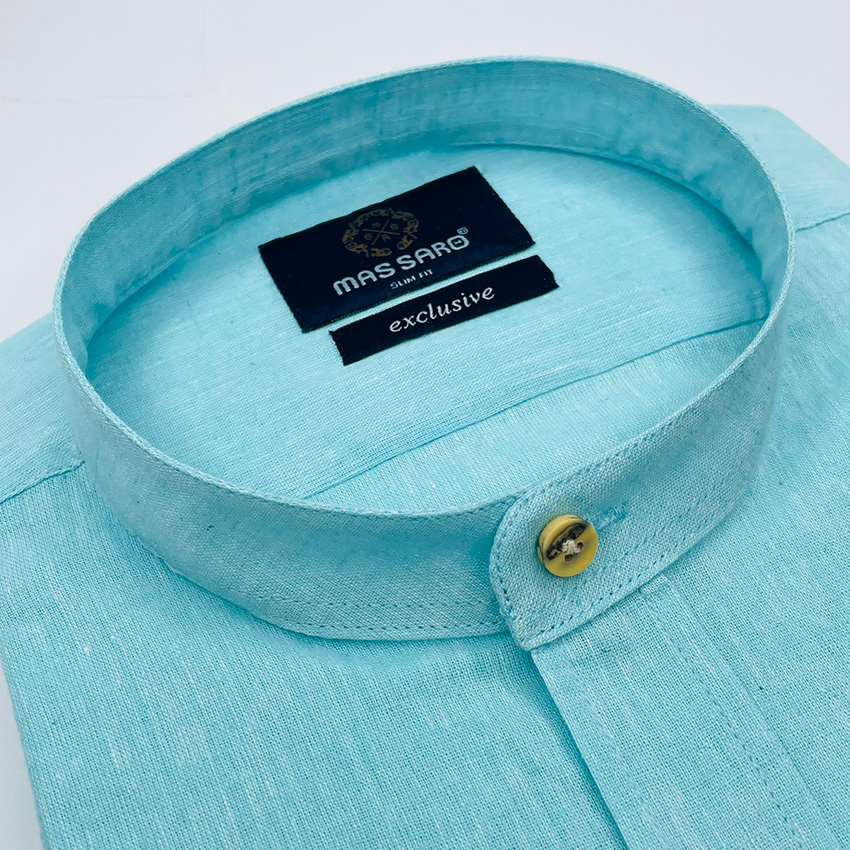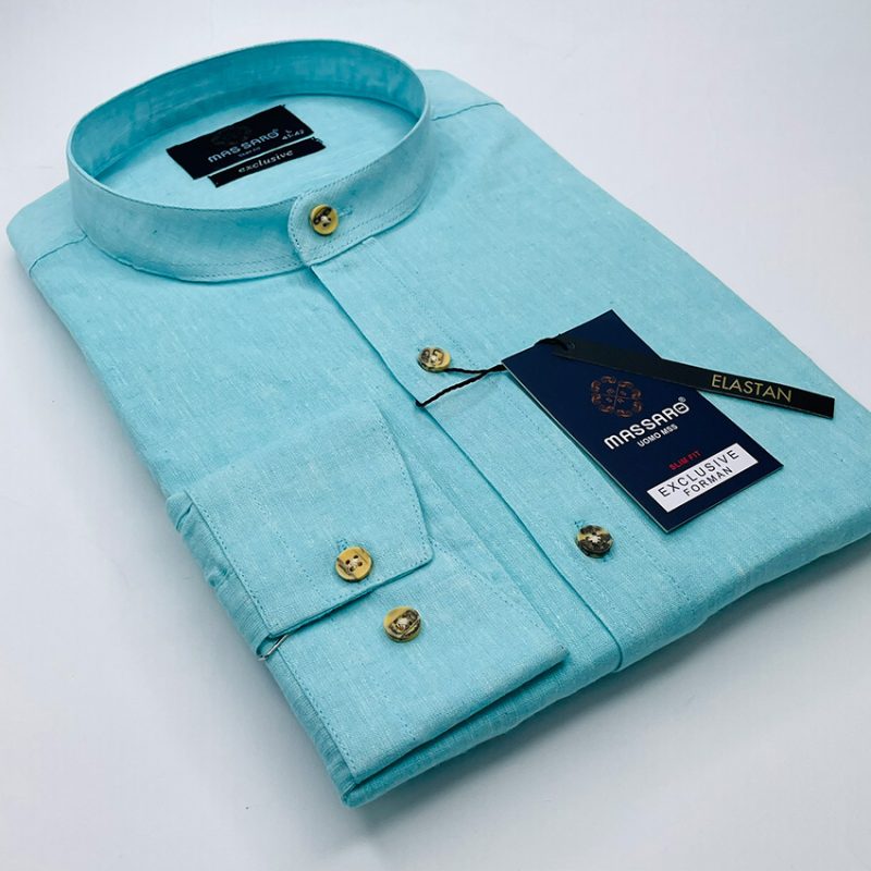 Lniana koszula męska z długim rękawem ze stójką z lycrą SLIM-FIT