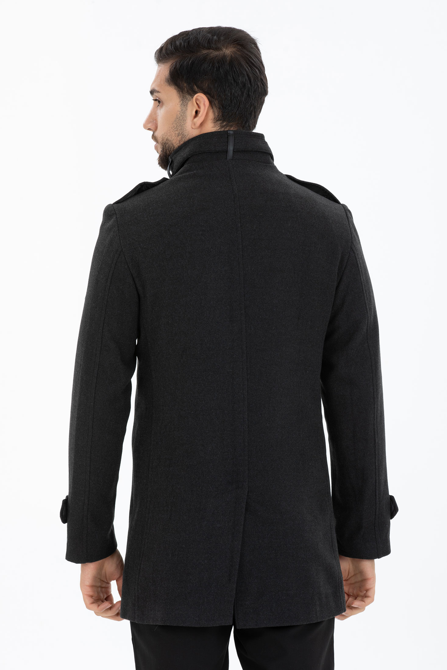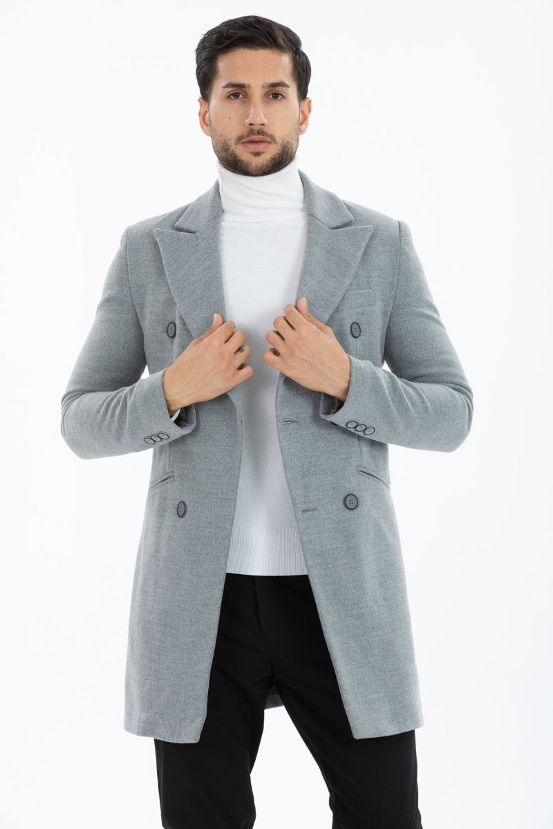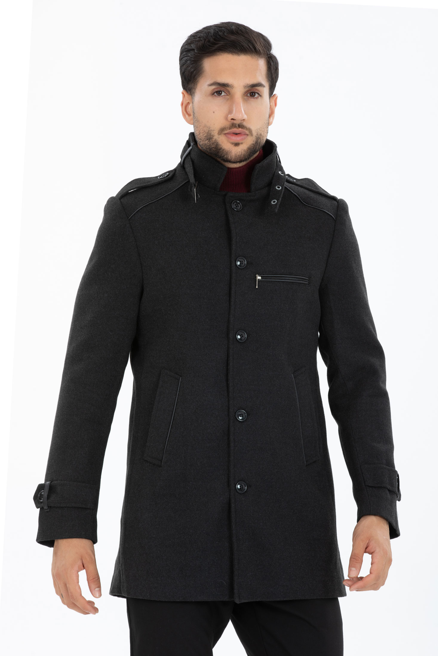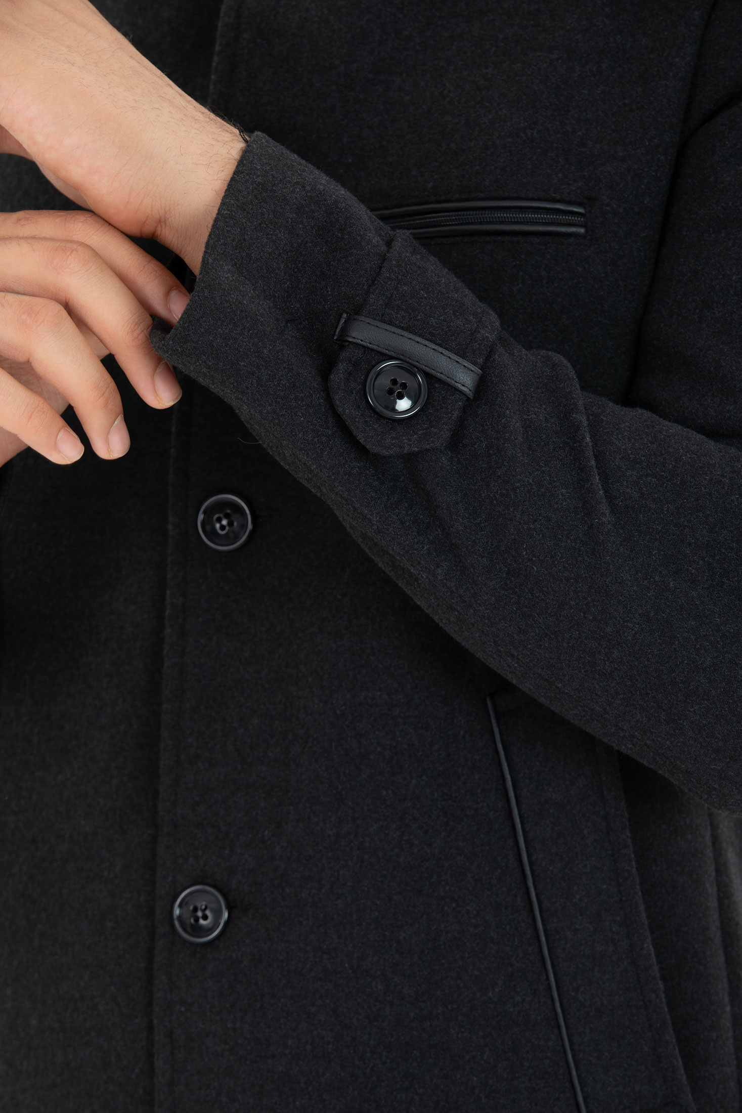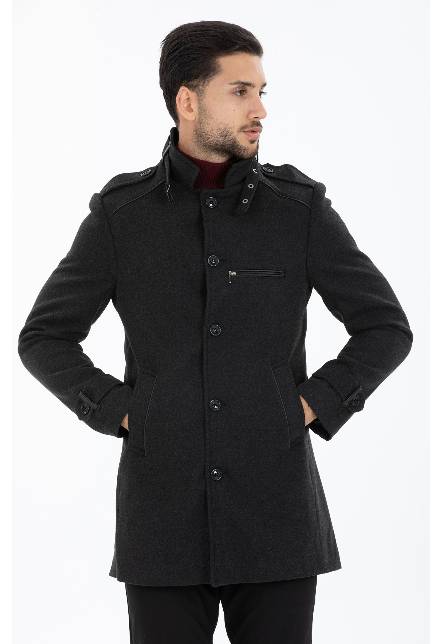 Elegancki jednorzędowy Płaszcz, w ciemnoszarym kolorze. Trzy kieszenie z przodu i jedna od środka. Płaszcz taliowany, idealny na jesień, zimę.