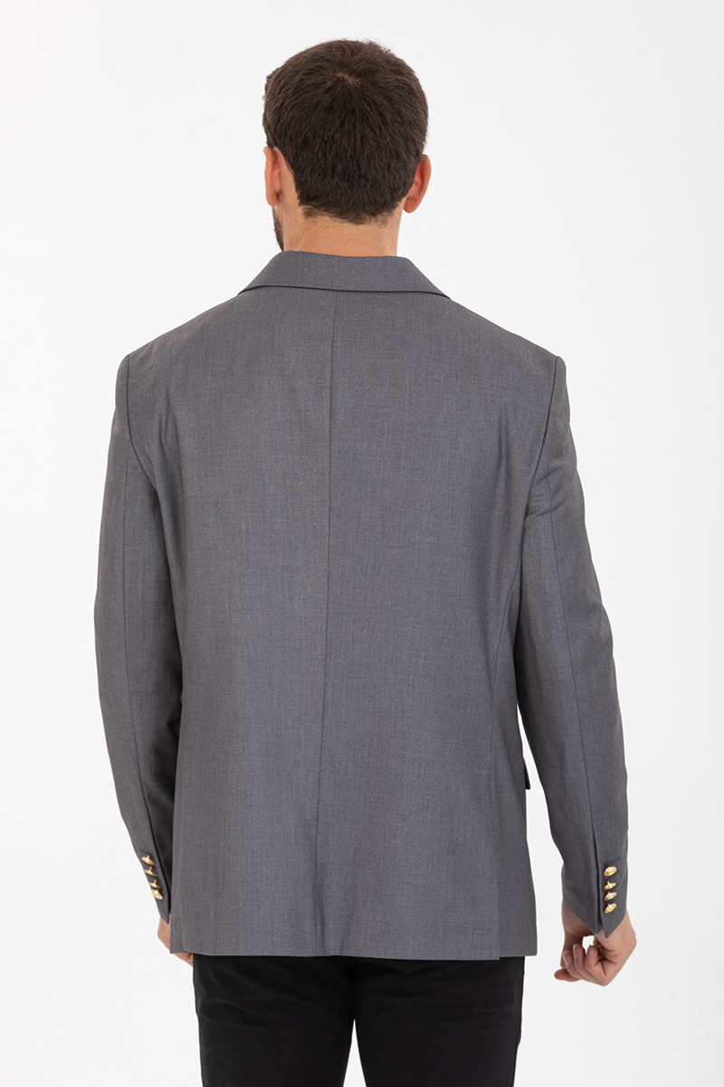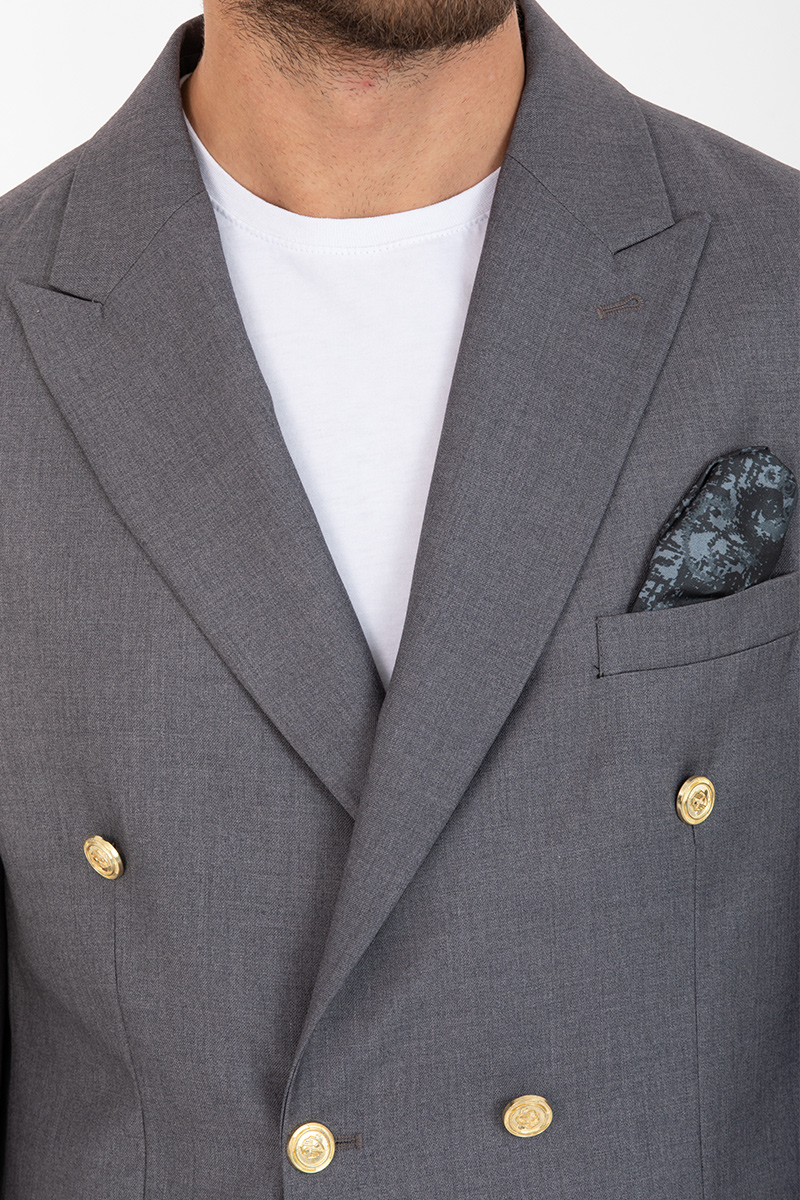 Elegancka marynarka męska w klasycznym szarym kolorze, uszyta z wysokiej jakości tkaniny z delikatnym wzorem. Dostępna w małych i dużych rozmiarach od 48 do 58. Marynarka posiada szerokie, otwarte klapy typu «peak lapel», obniżony punkt środkowy, dwa rozcięcia z tyłu.