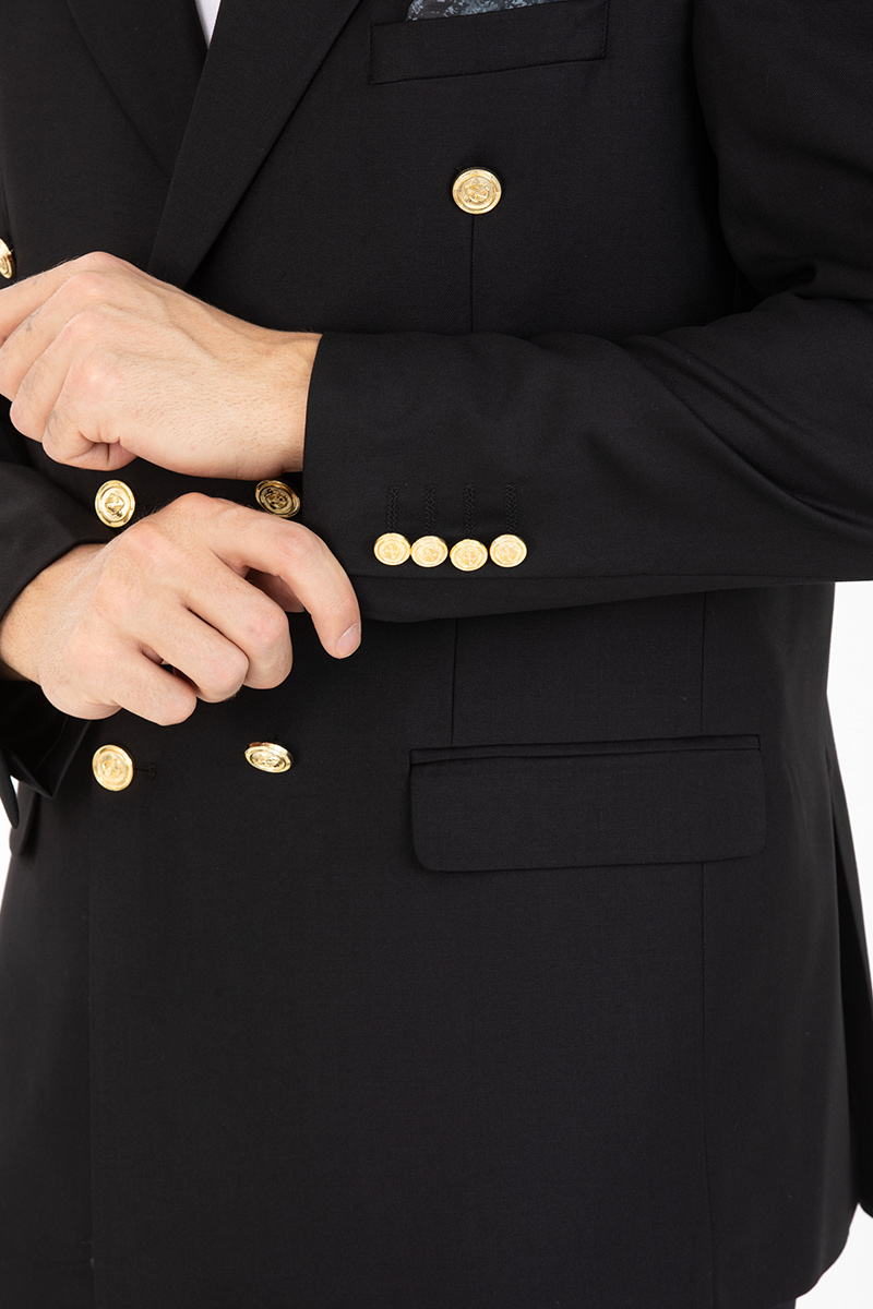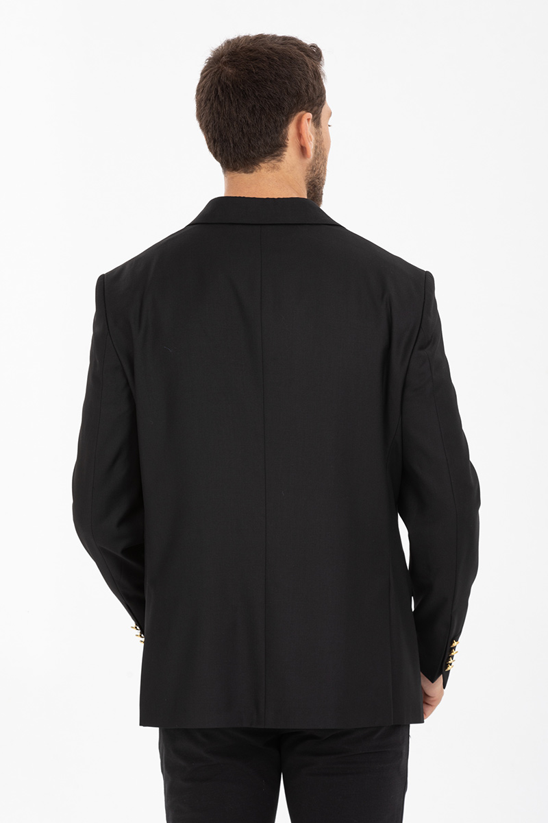 Elegancka marynarka męska w klasycznym czarnym kolorze, uszyta z wysokiej jakości tkaniny z delikatnym wzorem. Dostępna w małych i dużych rozmiarach od 48 do 58. Marynarka posiada szerokie, otwarte klapy typu «peak lapel», obniżony punkt środkowy, dwa rozcięcia z tyłu.